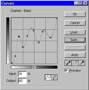 Nooow the tricky part. Goto Image > Adjust > Curves. Try tweaking it around.. The finished thing should look like the image just below this (sans the icicles). To the left is an example of the one I used for the pic.