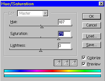 Next we convert the image to RGB color (Image > Mode > RGB). And do Image > Adjust > Hue/Saturation. At left are the things I selected for ice tones. Feel free to play around with them!