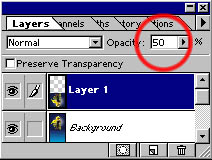 Moveto the layer control box, go to where the red circle is, thatis your opacity, you'll want to set it around 50 percent, makingsure the layer you do it to is the one you just pasted on there....