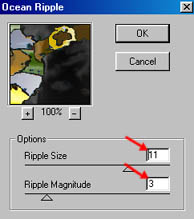 Filter>Distort>OceanRipple is one way to add water effects, going to Filter>Distort>Shearwill add wave effects too, even tho I didn't use it in this picture.The red arrows are the settings that I use for a mild ripple ;)Flatten the Image, and your done! You can see the finished pic Here!