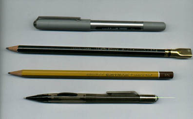 Hehheh, these are in no particular order, but fromtop to bottom,I'll say what they are, and what I use them for. On the top isa Vision Uni-ball pen that you can get anyplace that sells officesupplies, Wal-Mart, Walgreens, Office Max, Office Depot. I useit to go over my ink lines after I've colored a drawing with Prisma's,to make them stand out more. I like it because it rarely getscloggedand makes a nice dark line, be careful of smudging tho.Nextis my Eberhard Faber 'Blackwing' As it says on the pencil, halfthe pressure. twice the speed ;) Makes a nice smooh line for whenI'm doing plain pencil pictures. Next is a 2H pencil. My Mom gotit for me somewhere, I just know I like to use it for shadingand actually diong understucture, because it's a very hard lead,easy to erase later on. And on the bottom...all hail the mightymechanical pencil! I've used that pencil since late 98 to do themajority of ALL of my drawings. I love that thing :)