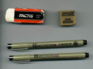 Onthe top left is my favored eraser. It's a white one, good forremoving drawing lines from a picture, once it's been inked. It'svery soft and can be broken easily tho, thats why I keep it ina little cardboard holder. Next to that is my gum eraser. Nowthis is GREAT for erasing pencil on rougher types of paper, andeven tho I have the rosart one scanned, do not, I repeat Do NOTuse a roseart one if you can fine a General's one. The roseartwill erase, but it likes to smudge at the same time :P The nexttwo are my disposable rapidiograph pens, these are what I inkwith. You can get these in all different sizes, from the sizeof a pin head on up. So far, these have been the best inking thingsI've come across, even tho I do love to ink with a brush now andthen.