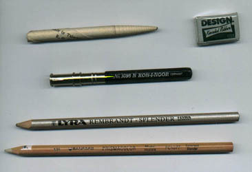 Topleft is a blender! Is just a rolled out piece of hard paper, thoyou can by them like that in all sizes, works on pencils, andcharcoal to get a blended look, where ones fingers might be toobig. Next is an amazing revolution for color pencil users everywhere....thepencil extender! Get another two inches out of your beloved (Yethorribly expensive) Colored pencils! The next two are two diferentbrands of color pencil blenders, aka splenders. Very good fortaking out thos patchy white spots commonly found in color pencildrawings. And almost forgot! Upper right hand corner, I foundagum eraser thats still in it's package! Its very mallable, kindalike silly putty, so you can work it to whatever shape you need.Used mostly for charcoal types of work.